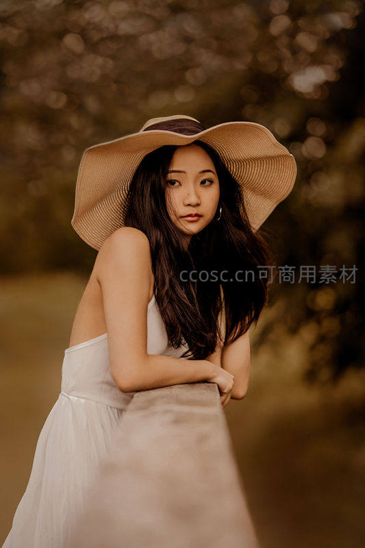 女子头戴大檐草帽,身穿素雅白裙,双手轻搭木栏,眼神温柔地望向镜头,背景虚化形成柔美光斑,整体色调温暖而富有故事感。