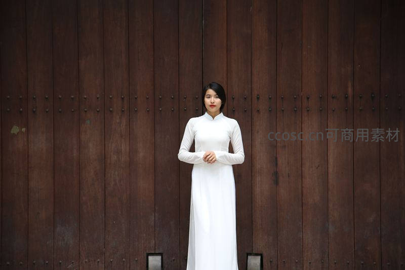 一位身着纯白越南奥黛的传统服饰女子,静静站立在深棕色木质大门前,双手交叠于身前,姿态端庄,背景简洁,凸显东方古典之美。