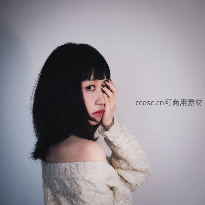 黑发齐刘海少女身着宽松针织衫,在纯色背景前轻抚面颊,眼神流露淡淡忧郁,整体画面简洁而富有情感张力。