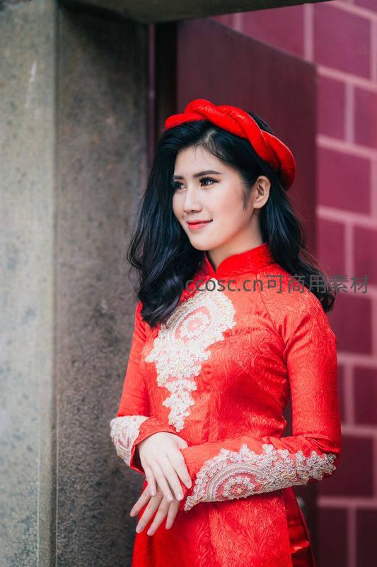 一位身着红色传统服饰的女子,头戴红色发饰,倚靠在砖墙旁,面带温柔微笑,展现出古典与现代交融的美感。