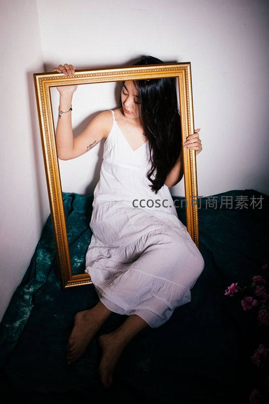 一位身穿白色连衣裙的女子坐在深绿色床单上,双手举着一个金色画框将自己框住,姿态优雅,旁边点缀着粉色花朵,充满艺术气息。