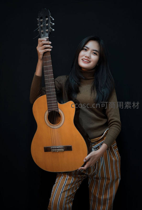 一位笑容灿烂的年轻女子身穿棕色高领毛衣,怀抱一把古典吉他,姿态优雅自信,黑色背景突显了她的活力与音乐的纯粹感。