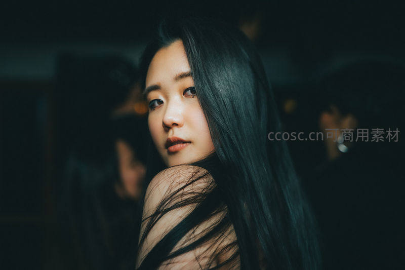 一位黑发女子在昏暗背景下回眸,眼神深邃,氛围感十足,展现了人物的神秘与优雅气质。