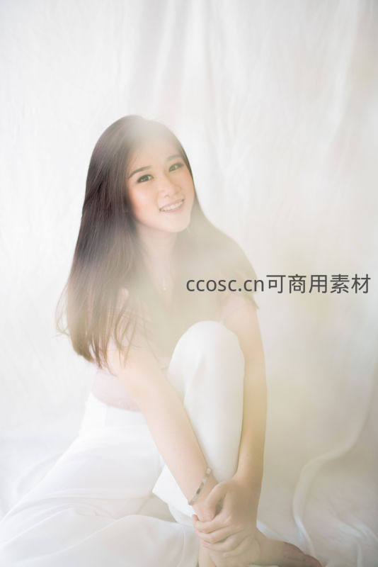 身着白衣的少女坐在纯白背景前,柔和光线洒落,笑容温暖纯净,营造出宁静美好的视觉感受。