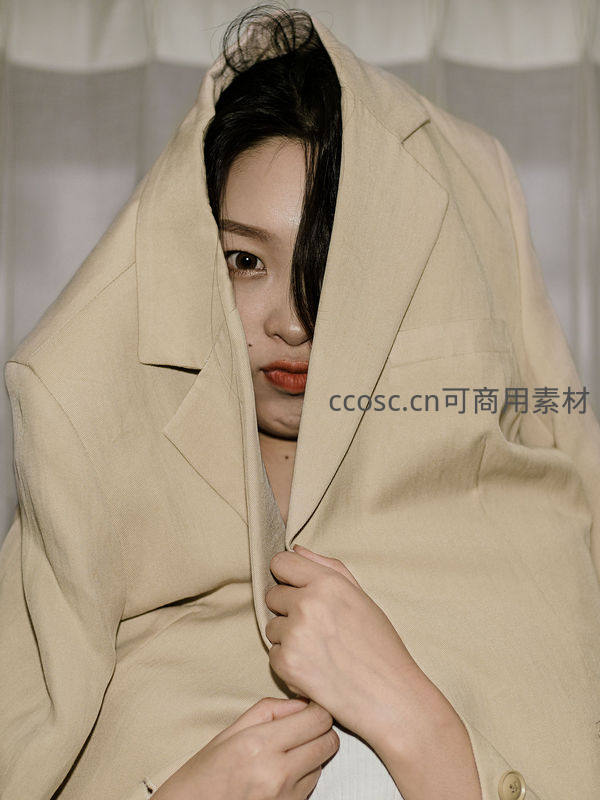 女子用米色西装外套半遮面容,仅露出一只眼睛和红唇,充满时尚感与神秘气息,引人遐想。