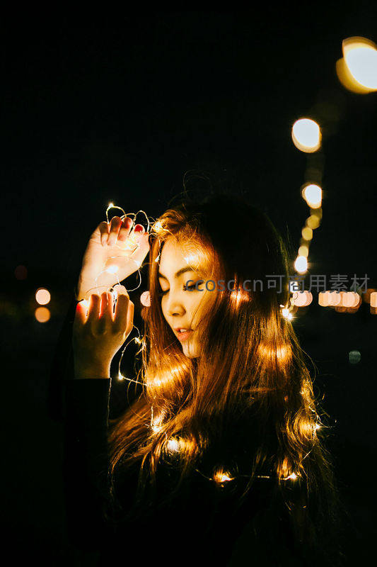 在漆黑的夜晚背景下,少女闭目轻触缠绕于发间的暖黄色灯串,柔和光线勾勒出她的轮廓,营造出宁静、温馨而富有诗意的视觉效果。