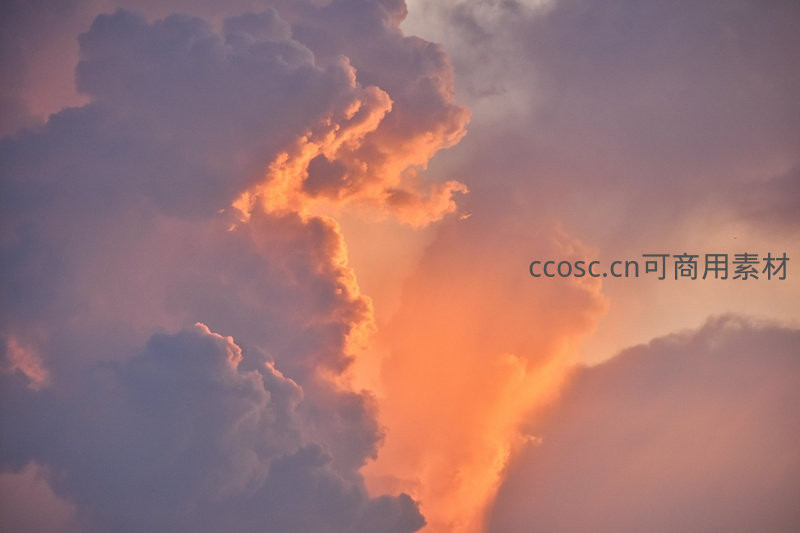 夕阳将巨大的积云边缘染成耀眼的橙红色,与暗紫色云体形成强烈对比,勾勒出如山峦般雄伟的轮廓。