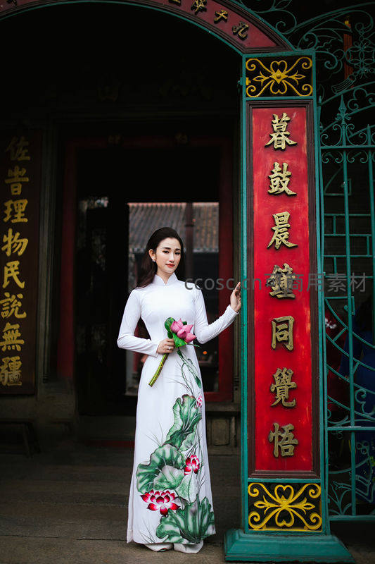女子身穿绘有莲花图案的白色长款旗袍,手执粉色荷花,倚靠在刻有金色对联的朱红门柱旁,背景为传统中式庭院,充满宁静禅意与文化气息。