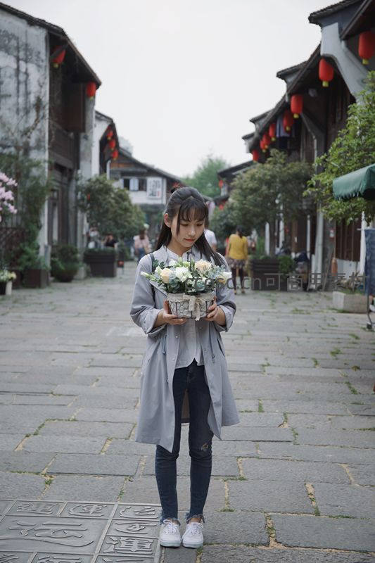 一位年轻女子身着灰色风衣,手捧一篮鲜花,静静伫立在青石铺就的古街上,两旁是白墙黛瓦的传统建筑和高挂的红灯笼,充满宁静与诗意。