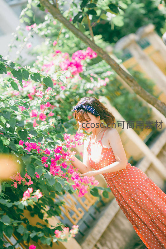 阳光明媚的午后,一位身穿橙色波点连衣裙的少女站在繁茂的粉色三角梅丛中,她低头轻抚花朵,脸上洋溢着温柔的笑容,画面甜美清新。
