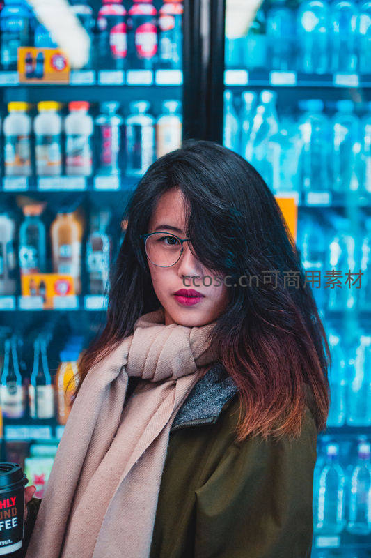 女孩手持一杯咖啡,站在蓝光闪烁的冷饮柜前,戴着眼镜,围着米色围巾,眼神略带忧郁地望向镜头,营造出一种安静而文艺的都市氛围。