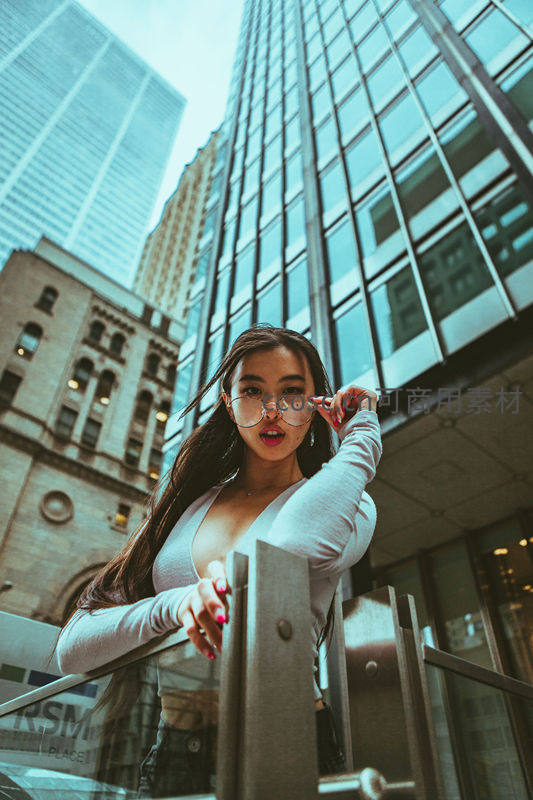 都市高楼间戴眼镜的时尚女郎