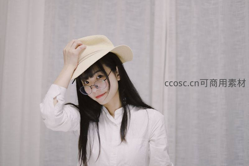 一位戴着眼镜、穿着白衬衫的年轻女子,微笑着用手调整米色帽子,背景为素雅窗帘,整体风格清新文艺。
