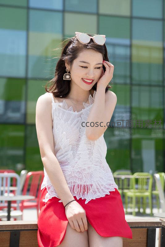 阳光明媚的户外,一位身着白色蕾丝上衣与鲜红短裙的女子坐在长凳上,面带灿烂微笑,手抚秀发,尽显轻松愉悦的夏日风情。
