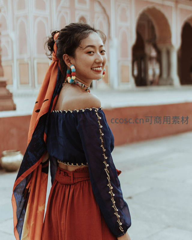 身着蓝红异域服饰的女子在古建筑前微笑回眸,头巾飘逸,彩色耳环与颈饰点缀,充满旅行与文化交融的浪漫气息。