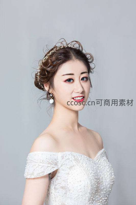 新娘身着缀满珠饰的白色露肩婚纱,头戴精致发冠,侧脸微笑,妆容清透,尽显婚礼当日的幸福与高贵典雅气质。