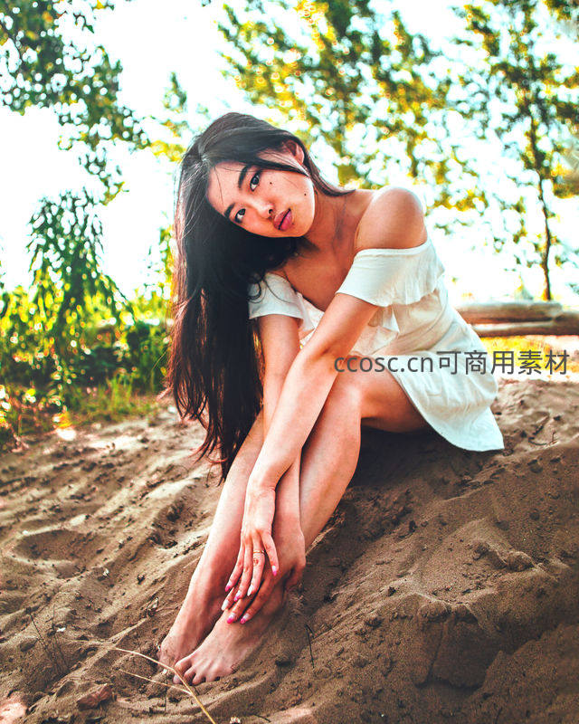 一位身穿白色露肩连衣裙的少女赤脚坐在柔软的沙丘上,阳光透过树影洒落,她低头凝视,享受着海边悠闲自在的午后度假时光。