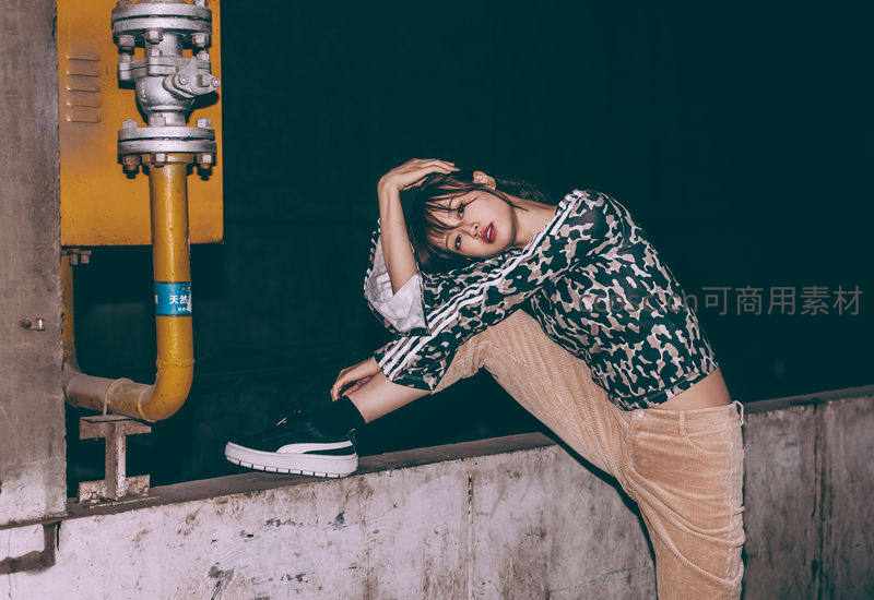 一位年轻女性在工业背景前摆出优雅姿势,身穿迷彩上衣与灯芯绒裤,脚踩运动鞋,展现出独特的街头时尚感。