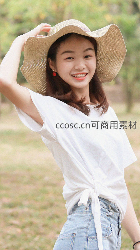 阳光下,一位戴着宽檐草帽的女孩在绿意盎然的公园中微笑,白色T恤搭配牛仔短裤,尽显青春活力与自然惬意。