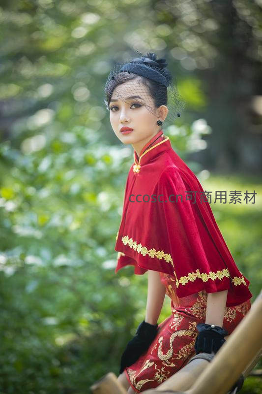 一位身着红色刺绣旗袍、佩戴黑色网纱头饰的女子坐在竹椅上,背景是绿意盎然的庭院,展现古典东方韵味与现代时尚融合之美。