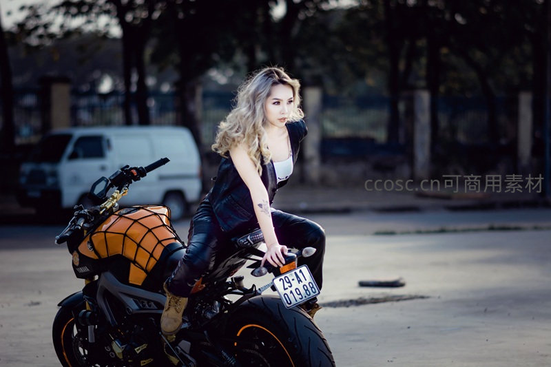 一位金发卷发的女子身着黑色皮夹克与紧身裤,坐在一辆橙黑配色的重型摩托车上,背景是黄昏下的街道与树木,散发出自由不羁的街头气息。