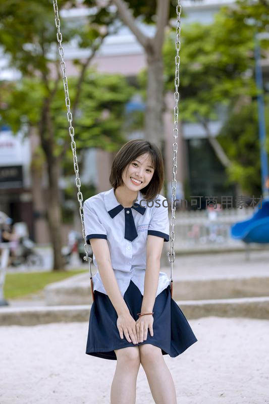 身穿白色校服的短发少女坐在秋千上,面带甜美笑容直视镜头,背景是绿树成荫的校园或公园,充满青春活力与纯真气息。