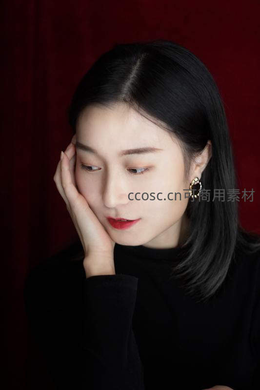 女子身穿黑色上衣,在深红色背景前托腮凝视,妆容精致,神情专注内敛,展现出一种安静、优雅且略带忧郁的气质。
