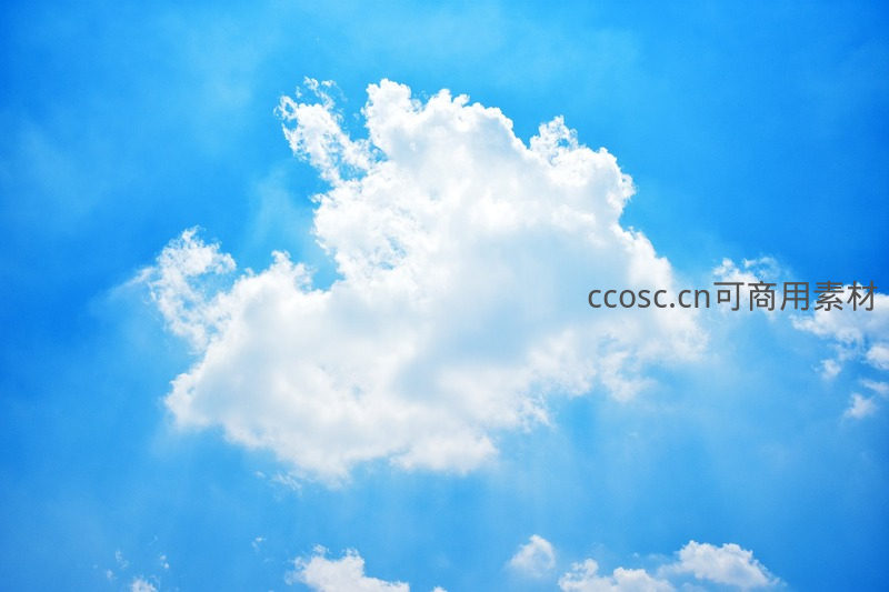 纯净的蓝色天空中漂浮着蓬松洁白的云朵,阳光洒落,营造出宁静而开阔的视觉感受。