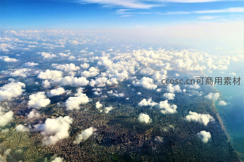 从高空视角俯瞰,城市被层层叠叠的白云覆盖,远方是蔚蓝的海岸线,景象壮阔而梦幻。