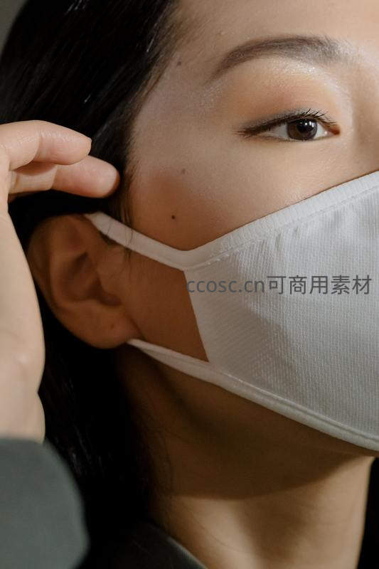 一位年轻女性佩戴白色口罩的微距特写,展现其专注的眼神与精致妆容,传达健康防护与现代生活美学。