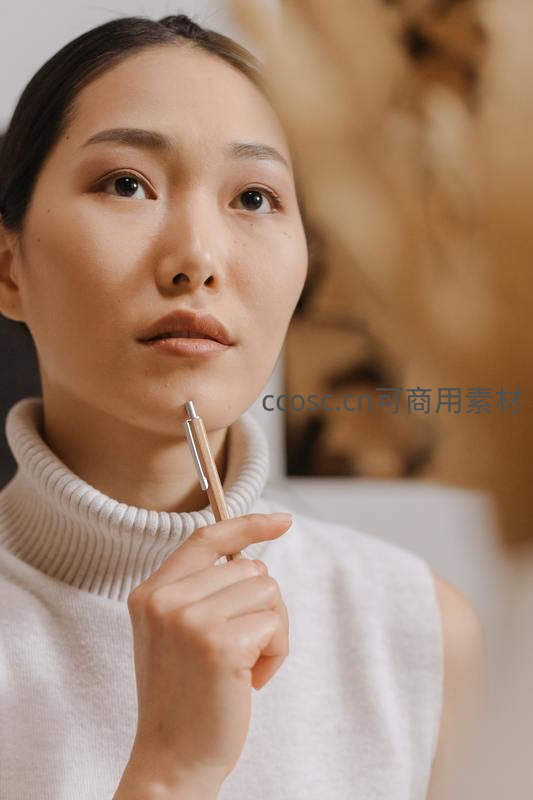 一位穿着米白色高领无袖毛衣的女子,手托下巴持笔凝思,眼神望向远方,背景柔和模糊,营造安静专注的氛围。