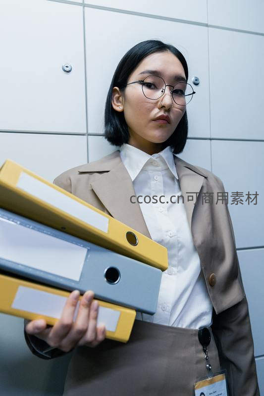 一位佩戴眼镜、身着米色西装的职场女性抱着黄色和灰色文件夹,胸前挂着工牌,表情严肃专注,展现现代职业女性形象。
