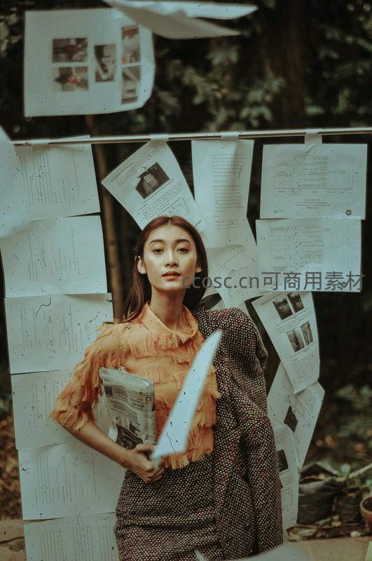 一位女子站在挂满纸张和照片的背景前,手持报纸,神情专注,仿佛沉浸在创作或研究中,散发浓郁的文艺与知性气息。