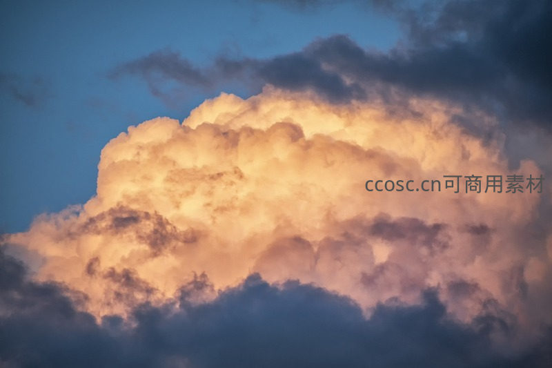 夕阳余晖将巨大的积云染成橙红色,与深蓝天空形成鲜明对比,展现出大自然的绚丽与力量。