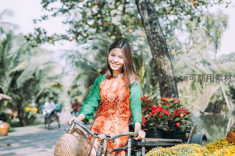 身着传统服饰的女子推着载满鲜花的自行车,穿行于绿树成荫的小径,阳光透过树叶洒落,充满田园诗意与生活气息。