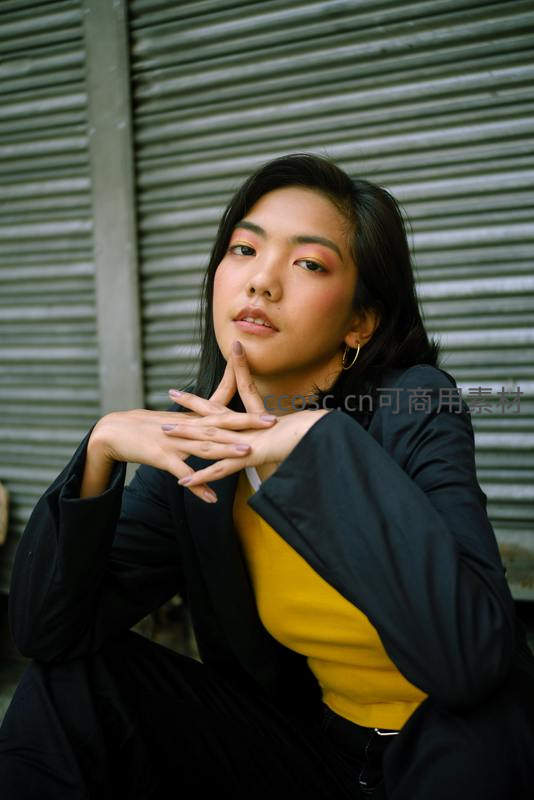 黑西装搭配亮黄色内搭的女子,坐在灰色卷帘门前,手指轻触下巴,眼神自信从容,整体造型干练又不失柔美,充满现代都市气息。