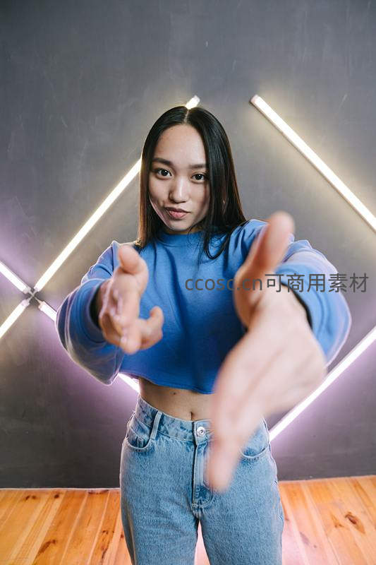 一位穿着蓝色短款卫衣和牛仔裤的女孩,站在几何形霓虹灯背景前,伸出双手邀请观众,充满活力与科技感的现代氛围。