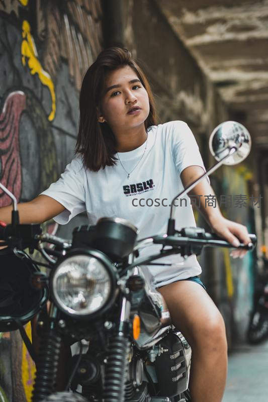 一位身穿白色T恤的少女坐在复古摩托车上,背景是充满艺术感的涂鸦墙,展现出青春活力与街头文化的完美融合,自由不羁。
