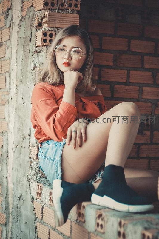 女孩坐在红砖台阶上,身穿橙色上衣与牛仔短裤,脚踩黑色袜套运动鞋,一手托腮陷入沉思,背景粗犷砖墙衬托出她安静而有型的姿态。