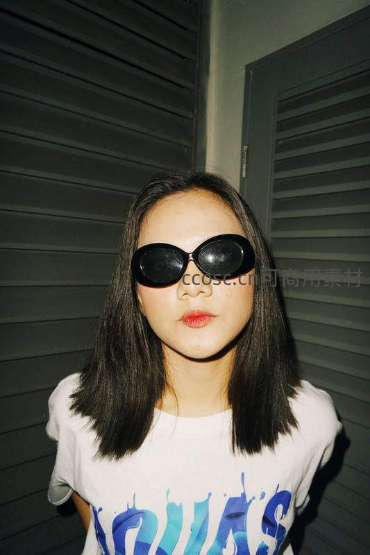 黑发女孩佩戴夸张黑色墨镜直视镜头,身穿印花T恤,背景为深色百叶窗,整体风格酷炫又带点慵懒感。