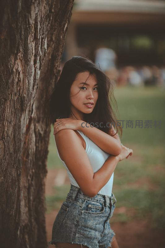一位年轻女子倚靠在粗壮的树干旁,阳光透过树叶洒下斑驳光影,她身穿白色背心和牛仔短裤,姿态放松,眼神温柔地望向镜头。