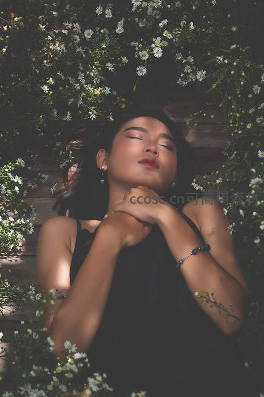 一位女子闭着眼睛躺在铺满小白花的木质地板上,双手交叠置于颈前,周围繁花似锦,阳光从缝隙洒落,营造出梦幻而安宁的氛围。