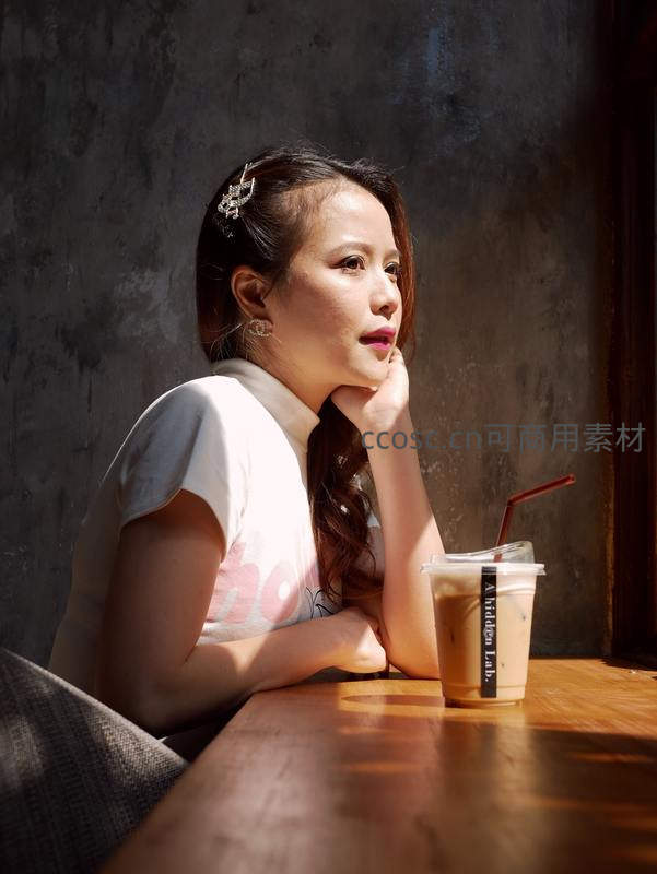 一位女士坐在咖啡馆窗边,手托下巴凝视远方,面前放着一杯冰咖啡,温暖的阳光洒在她的侧脸和木桌上,营造出慵懒惬意的午后氛围。