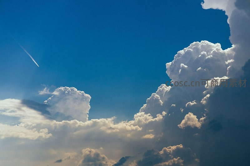 蔚蓝天空中,洁白的云朵与一架飞机留下的长长航迹相映成趣,展现了高空中宁静而又充满动感的景象。