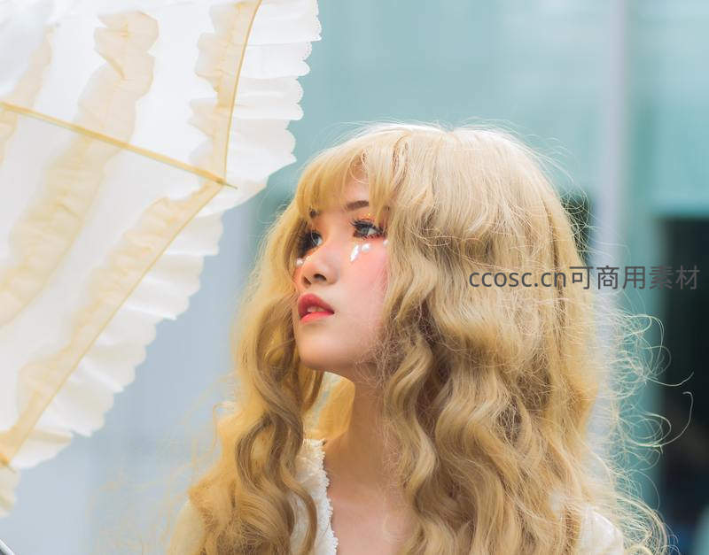 一位金发卷发的少女手持白色蕾丝阳伞,抬头仰望,脸上点缀着闪亮装饰,妆容精致,整体造型充满童话感与梦幻色彩,仿佛置身于幻想世界。