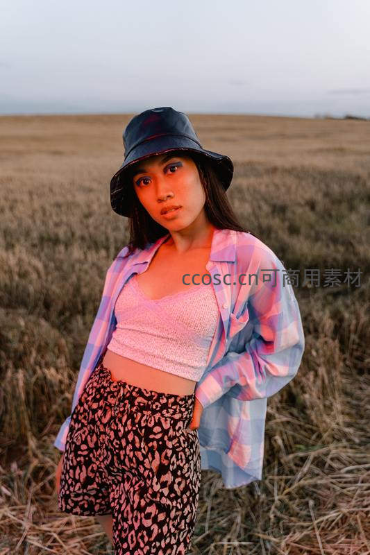 田野中的时尚少女,戴着渔夫帽凝视镜头