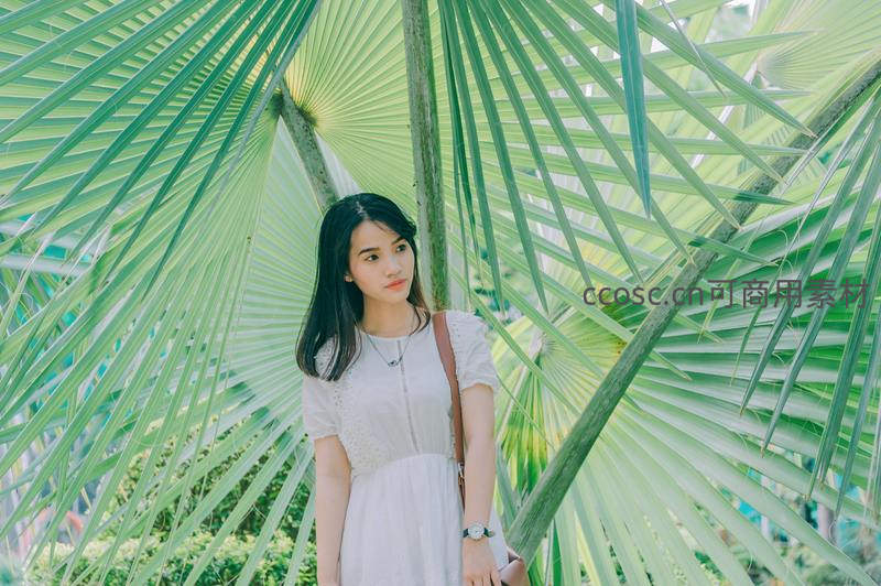 棕榈叶下少女微笑回眸,清新自然风