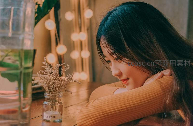 少女在暖黄色灯光的咖啡馆内托腮凝思,面前摆放着小瓶干花和玻璃杯,氛围温馨静谧,展现出都市生活中难得的悠闲与文艺气息。