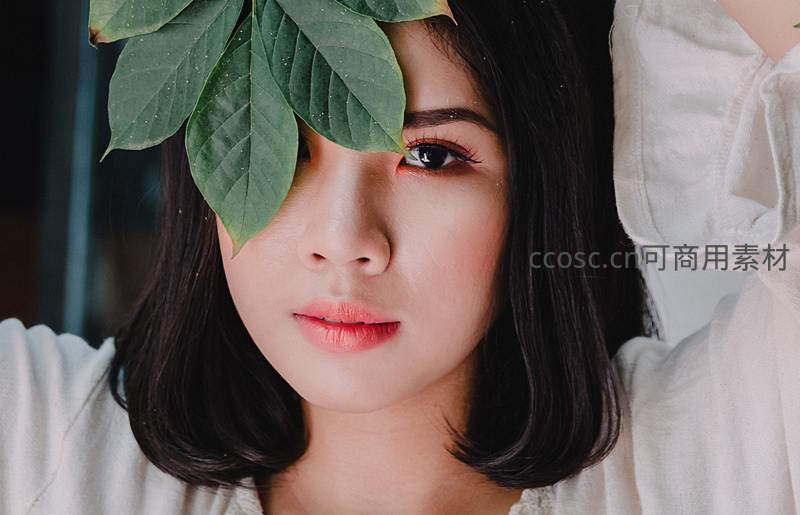 一位年轻女性用绿叶半遮面庞,眼神清澈而富有神采,黑色短发与白色衣衫形成柔和对比,展现自然与人文交融的静谧美感。