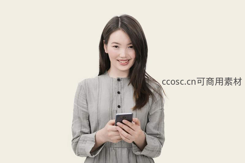 一位穿着灰色条纹连衣裙的女子面对镜头微笑,双手捧着手机,背景纯白干净,整体风格清新自然,展现现代生活的轻松一刻。